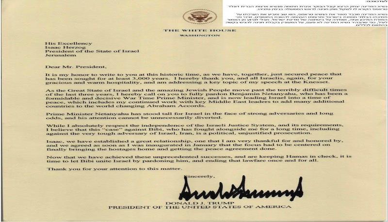 نووسینگهی سهرۆكی ئیسرائیل ئیسحاق هێرزۆگ ئاماژهی بهوه كرد، نامهیهكی له دۆناڵد ترهمپهوه بهدهست گهیشتووه كه داوای كردووه، "لێخۆشبوونی تهواو" بۆ سهرۆك وهزیران بنیامین نهتهنیاهۆ دهربچێت، كه له دادگا چهندان كهیسی گهندهڵی به روودا كراوهتهوه.