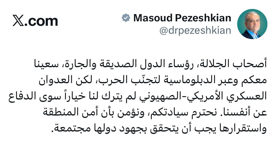 مەسعوود پزیشكیان سەرۆكی ئێران لە تویتێك بە زمانی عەرەبی لەو تۆڕی ئێكس نووسیویەتی، بۆ خاوەن شكۆكان سەركردەكانی وڵاتانی دۆست و دراوسێ، لەگەڵ ئێوە هەوڵمان دا بە رێگەی دیپلۆماسی رێگری لە شەڕ بكەین، بەڵام هێرشە سەربازییەكانی ئەمەریكا و ئیسرائیل هیچ بژارەیەكی تریان بۆ ئێمە نەهێشتەوە جگە لە بەرگریكردن لە خۆمان، ئێمە رێز لە سەروەریی ئێوە دەگرین، باوەڕیشمان وایە كە دەبێت ئاسایش و سەقامگیریی ناوچەكە و بە هەوڵی تەواوی وڵاتان بێتە دی.