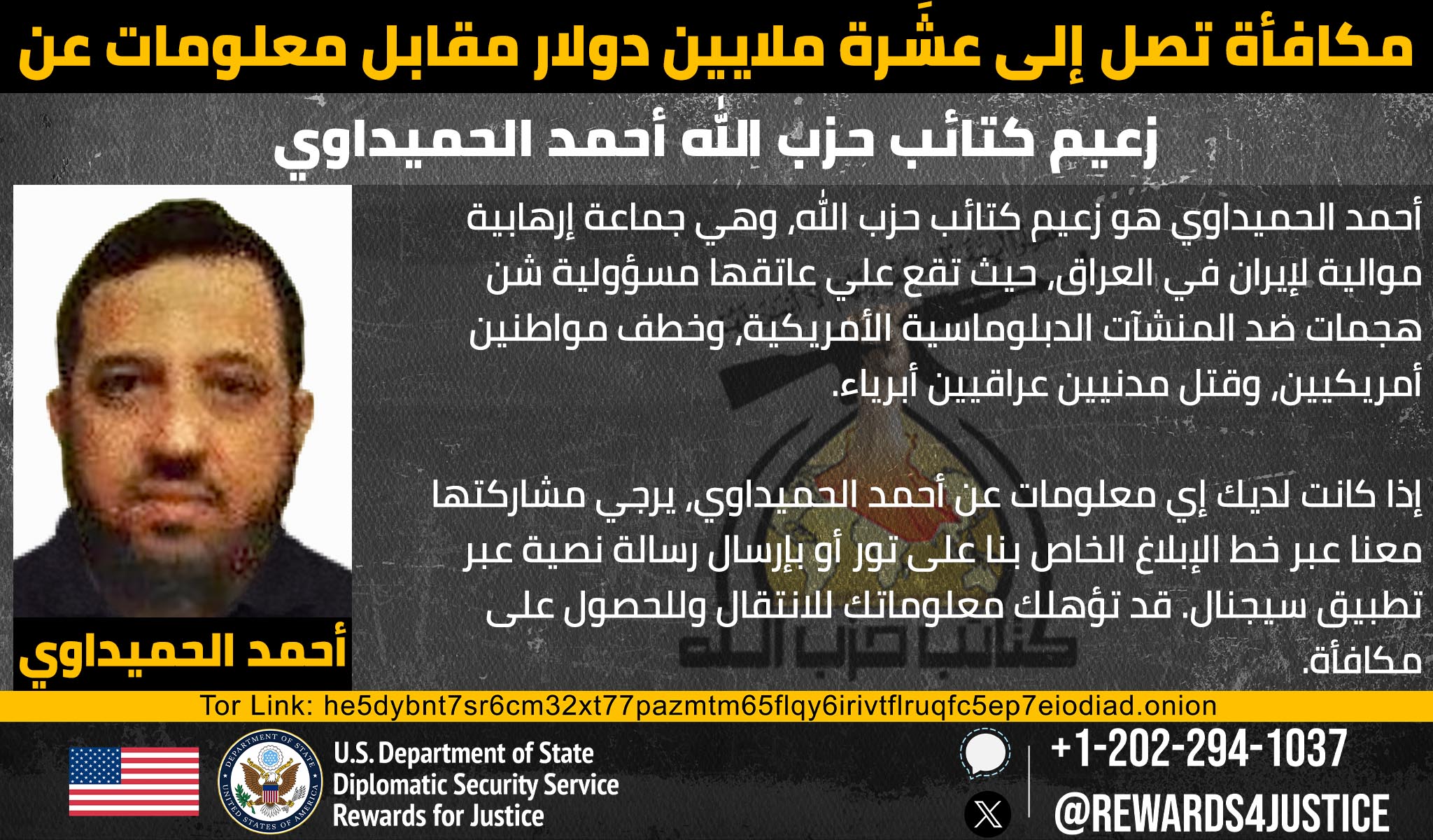 ئەو زانیارییانەی سەرەوە لەسەر پۆستەرێك نووسراوە، بەڵام بڵاوێزخانەی ئەمەریكا لە عێراق روونكردنەوەی زیاتر دەدات و دەڵێ، "خەڵكی سڤیلی بێتاوان كوژراون، هاووڵاتیانی ئەمەریكا رفێنراون، هێرش كراوەتە سەر دامەزراوەكان، بۆیە پاداشتێك دەدرێت كە دەكاتە 10 ملیۆن دۆلار لە بەرانبەر زانیاری لەبارەی ئەحمەد حەمیداوی، هاوكاریمان بكەن بۆ وەستاندنی توندوتیژی، هاوكاریمان بكەن بۆ وەستاندنی حەمیداوی".