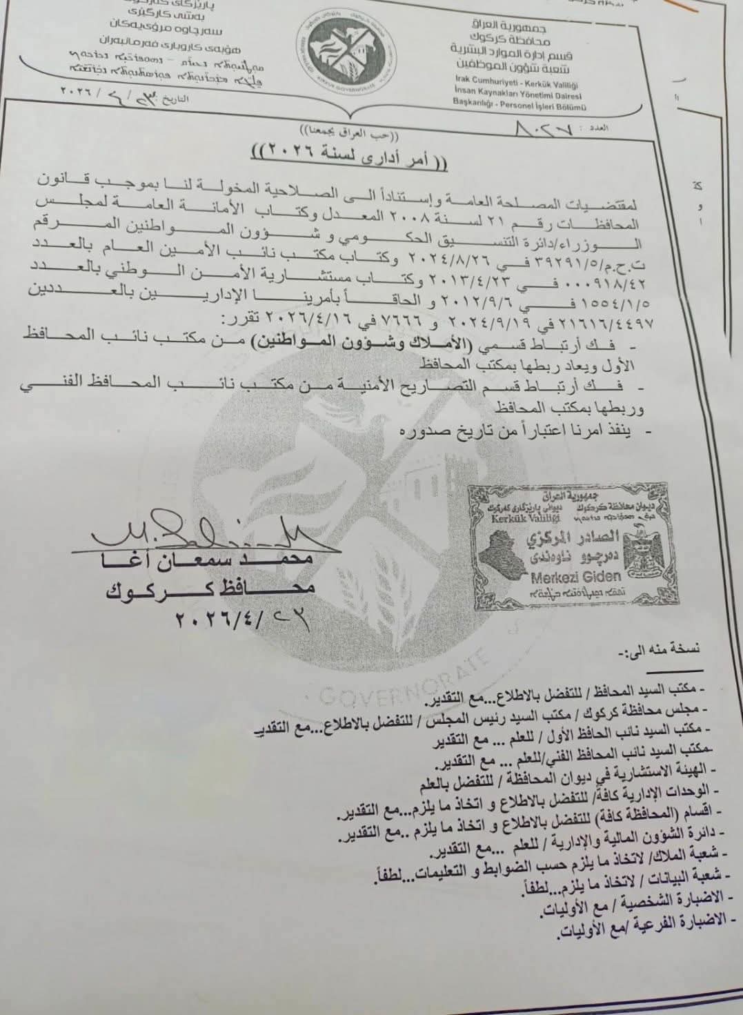 ئەمڕۆ یەكشەم 26ی نیسان، بەگوێرەی بەڵگەیەك كە دەست "وشە" كەوتووە، محەمەد سەمعان ئاغا پارێزگاری كەركووك، چەند دەسەڵاتێكی لە جێگرەكەی وەرگرتووەتەوە كە ئێستە رێبوار تەها بووەتە جێگری.