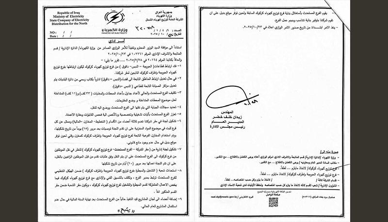 دکتۆر شاخەوان عەبدوڵڵا، سەرۆکی لیستی پارتی دیموکراتی کوردستان لە کەرکووک، بە بڵاوکردنەوەی دوو بەڵگەنامەی فەرمی، ئاشکرای کرد کە بڕیارێکی وەزارەتی کارەبا بۆ گواستنەوەی بەڕێوەبەرایەتیی کارەبای چەند ناوچەیەکی کوردنشین بۆ سەر حەویجە، چووەتە بواری جێبەجێکردنەوە. ناوبراو ڕای گەیاند، پێشتر هۆشداریی لەم "فێڵە" دابوو، بەڵام بەدرۆخرابووەوە.