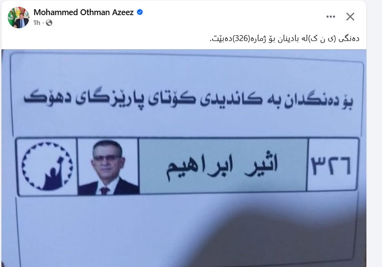 ئەمڕۆ دووشەم 10ی تشرینی دووەم، محەمەد دووشیوانی بەرپرسی مەڵبەندی دهۆكی یەكێتی، بە ئاشكرا لە فەیسبووكی خۆیەوە كەوتە رێكلامكردن بۆ كاندیدێكی رەیان كلدانی و داوا دەكات كە لایەنگرانی یەكێتی دەنگ بەو بدەن.