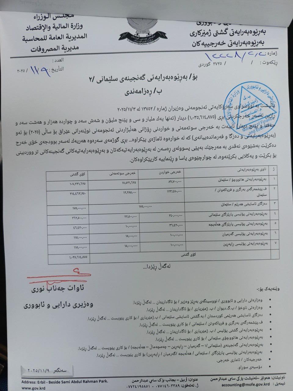 ئەمڕۆ سێشەم 11ـی تشرینی دووەم، لە نووسراوێكی وەزارەتی دارایی و ئابووریدا هاتووە، وەزارەتی دارایی هەرێم، بڕیاری دا پارەی ئەركی كارمەندانی وەزارەتی ناوخۆ لە ڕۆژانی هەڵبژاردن خەرج بكرێت.