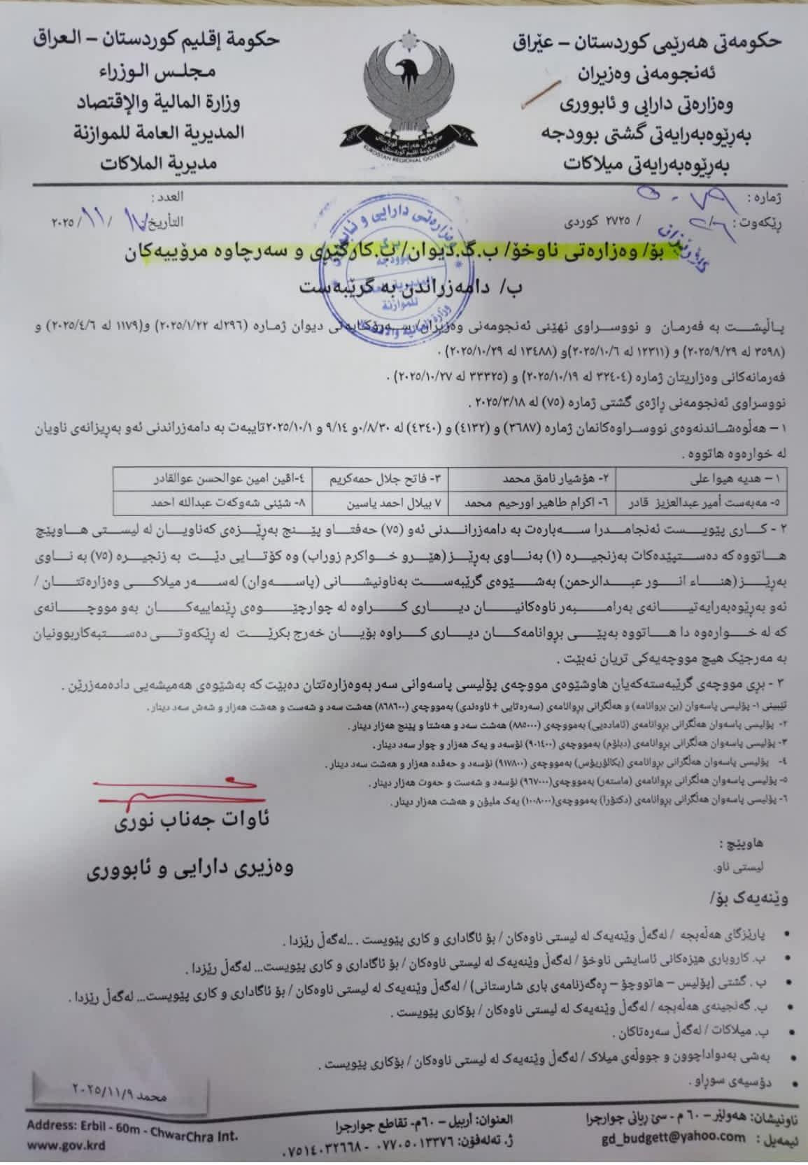 بەگوێرەی نووسراوێكی ئەنجوومەنی وەزیران، كاری پێویست كرا لەبارەی دامەزراندنی 75 كەس بەشێوەی گرێبەست، بە ناونیشانی "پاسەوان" لەسەر میلاكی چەند بەڕێوەبەرایەتییەك و بەگوێرەی بڕوانامە و مووچەی دیاریكراو كە لە رێكەوتی دەستبەكاربوونیان، بۆیان خەرج دەكرێت.