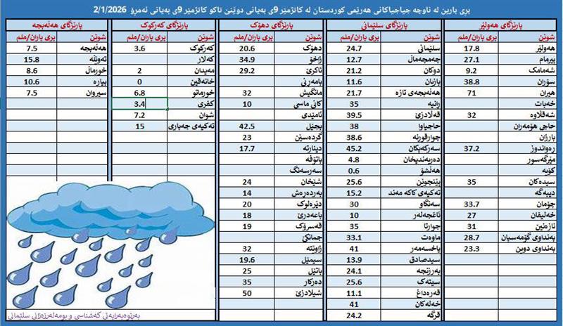 ئەمڕۆ هەینی دووی کانوونی دووەمی 2026، بەڕێوەبەرایەتیی کەشناسی و بوومەلەرزەزانیی سلێمانی، داتای بارانبارینی لە سەعات نۆی بەیانیی دوێنێ تا سەعات نۆی بەیانیی ئەمڕۆ بڵاو کردەوە.