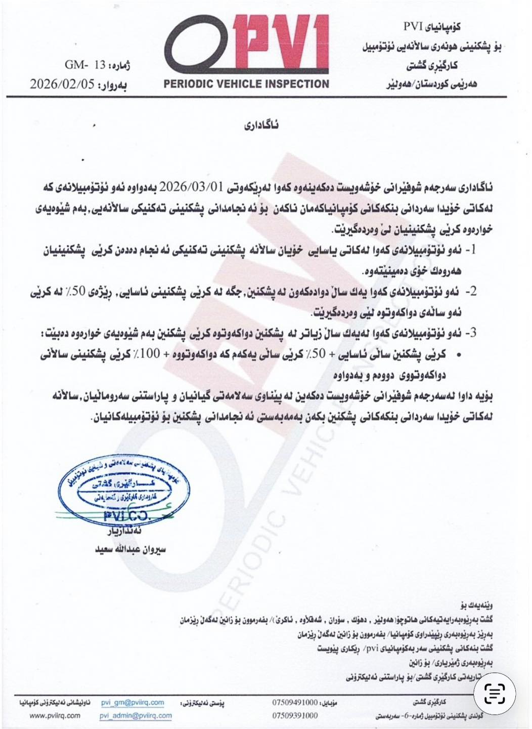 كۆمپانیای PVI ئاماژەی بەوە كردووە؛ ئەم هەنگاوە بۆ هاندانی شۆفێرانە تا ساڵانە و لە كاتی دیاریكراودا پشكنینی هونەری بۆ ئۆتۆمبێلەكانیان بكەن، ئەمەش بە مەبەستی دڵنیابوونەوە لە توندوتۆڵی ئۆتۆمبێلەكان و كەمكردنەوەی رووداوەكانی هاتوچۆ.