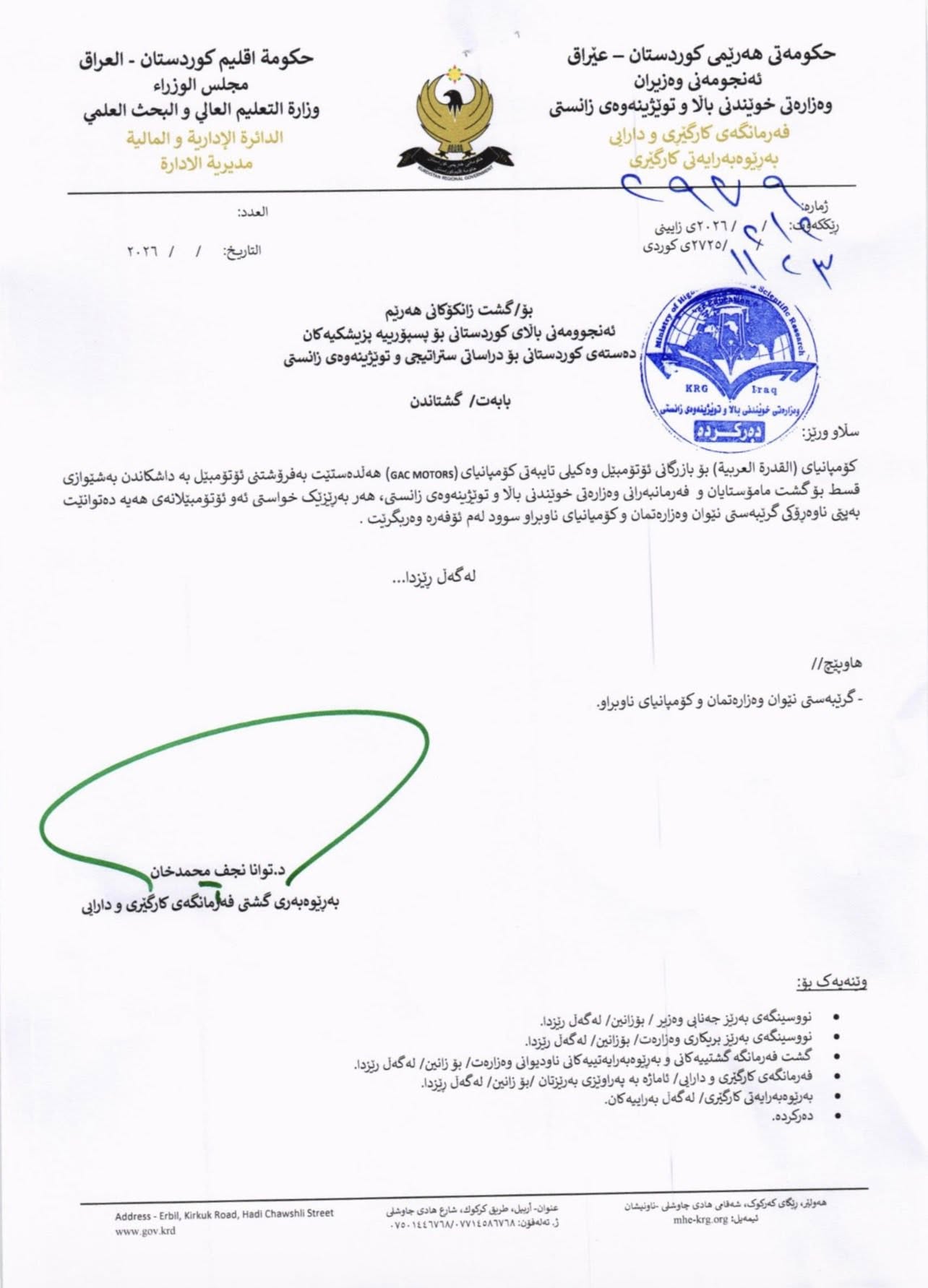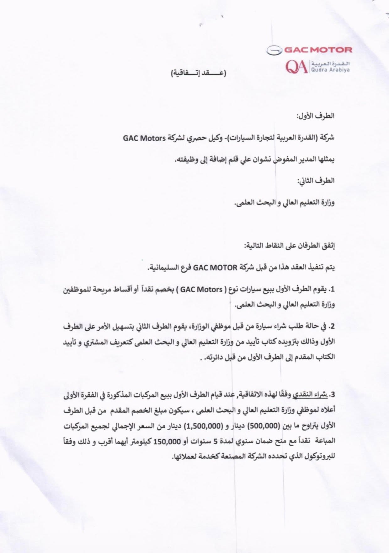 زیاتر گوتی، پوختەی گرێبەستی نێوان وەزارەتی خوێندنی باڵا و كۆمپانیای GAC Motor، بریتییە لە نووسراوێكی فەرمی و گرێبەستێك لە نێوان وەزارەتی خوێندنی باڵا و توێژینەوەی زانستی و كۆمپانیای القدرە العربیە (ویكلی سەرەكی GAC Motor) بۆ فرۆشتنی ئۆتۆمبێل بە فەرمانبەران و مامۆستایانی وەزارەت.