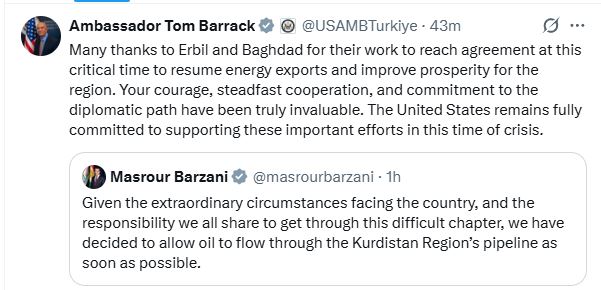 ئەمڕۆ سێشەم 17ی ئاداری 2026، تۆم باراک نێردەی تایبەتی دۆناڵد ترەمپ سەرۆکی ئەمەریکا بۆ سووریا و باڵوێزی ئەمەریکا لە تورکیا، لە کاردانەوەی پەیامەکەی مەسروور بارزانی سەرۆکی حكوومەتی هەرێمی کوردستان، ستایشی ڕێککەوتنی نێوان هەولێر و بەغدای کرد بۆ دەستپێکردنەوەی هەناردەی نەوت.