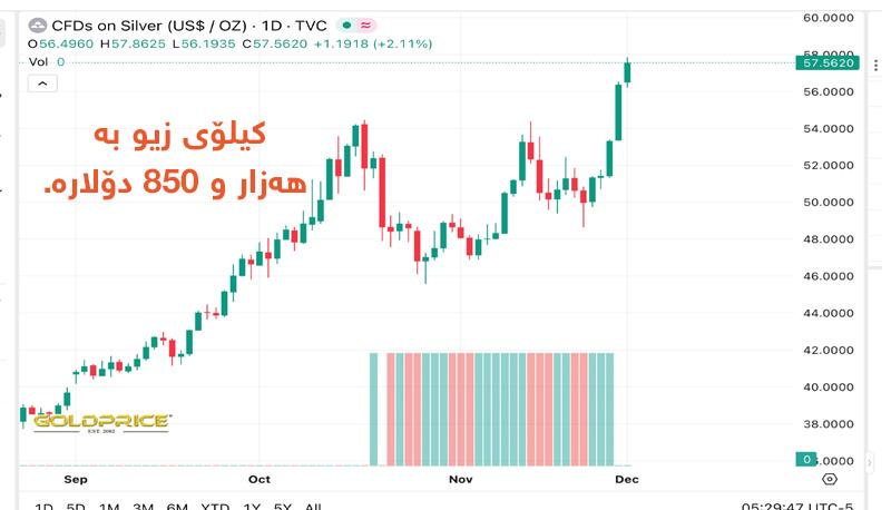 له مانگی تشرینی یهكهمی ساڵی 2022 واته سێ ساڵ لهمهوبهر، نرخی ههر كیلۆگرامێك زیو 600 دۆلار بوو، بهڵام دهبینرێت لهو كاتهوه نزیكهی ههزار و 250 دۆلاری هاتووهته سهر.