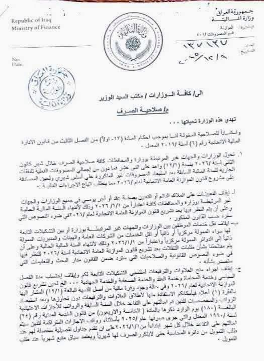 بهگوێرهى نووسراوێك كه ئهمڕۆ چوارشهم 10ى كانوونى یهكهم بڵاو كراوهتهوه و دوێنێ لهلایهن وهزارهتى دارایى عێراق دهرچووه، به بۆنهى كۆتاهاتنى ساڵى دارایى 2025، وهزارهتى دارایى كۆمهڵێك بڕیارى داوه لهوانه، ههموو وهزارهتهكان و دامهزراوهكان و پارێزگاكان، دهتوانن بهگوێرهى مادهى 11 له یاساى كارگێڕى دارایى فیدراڵى كه به ژماره شهشى ههمواركراوى ساڵى 2019.
