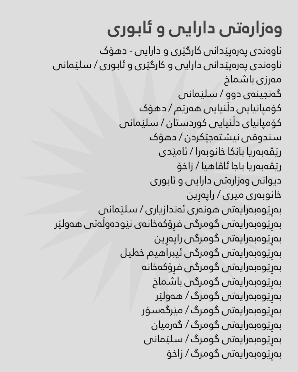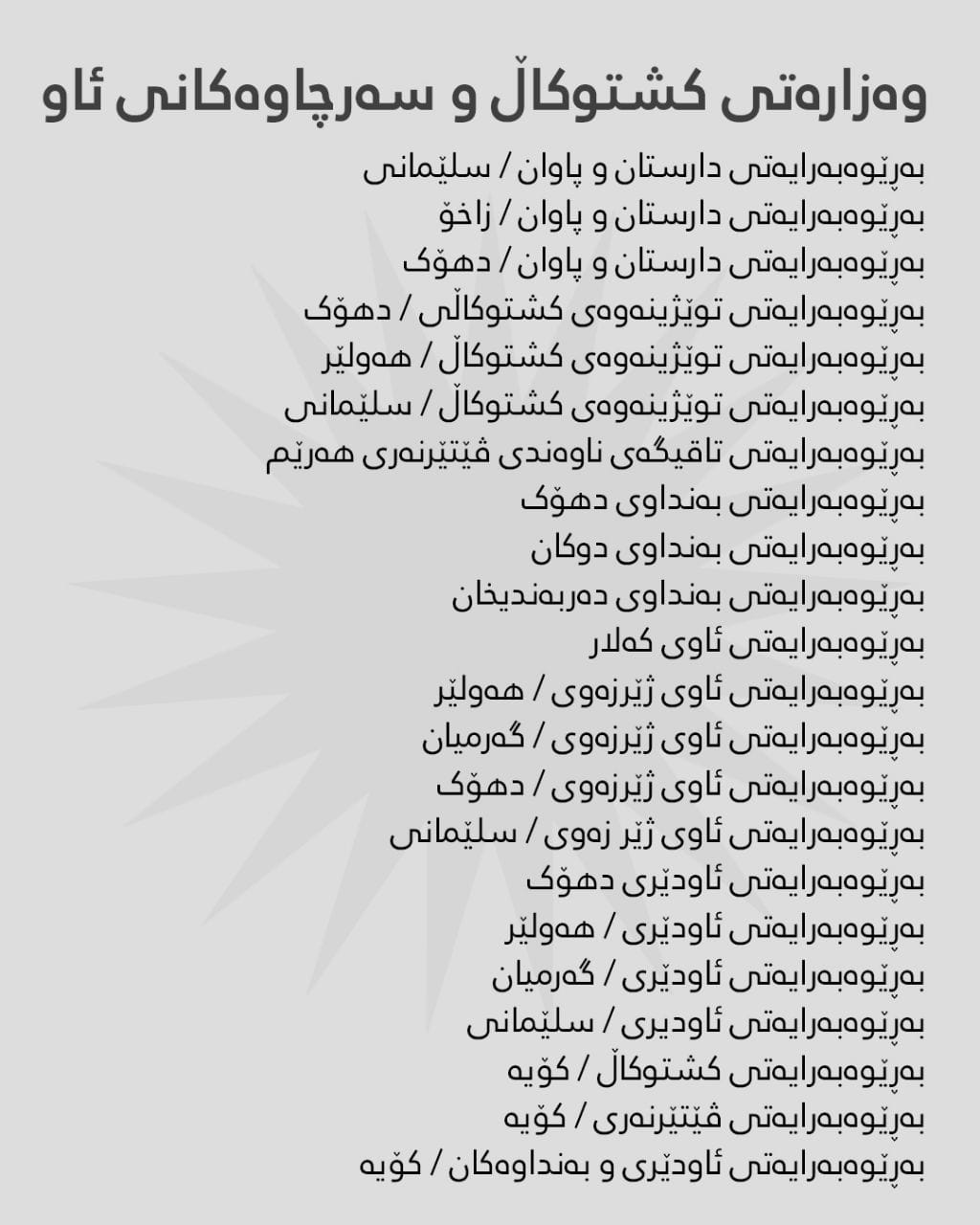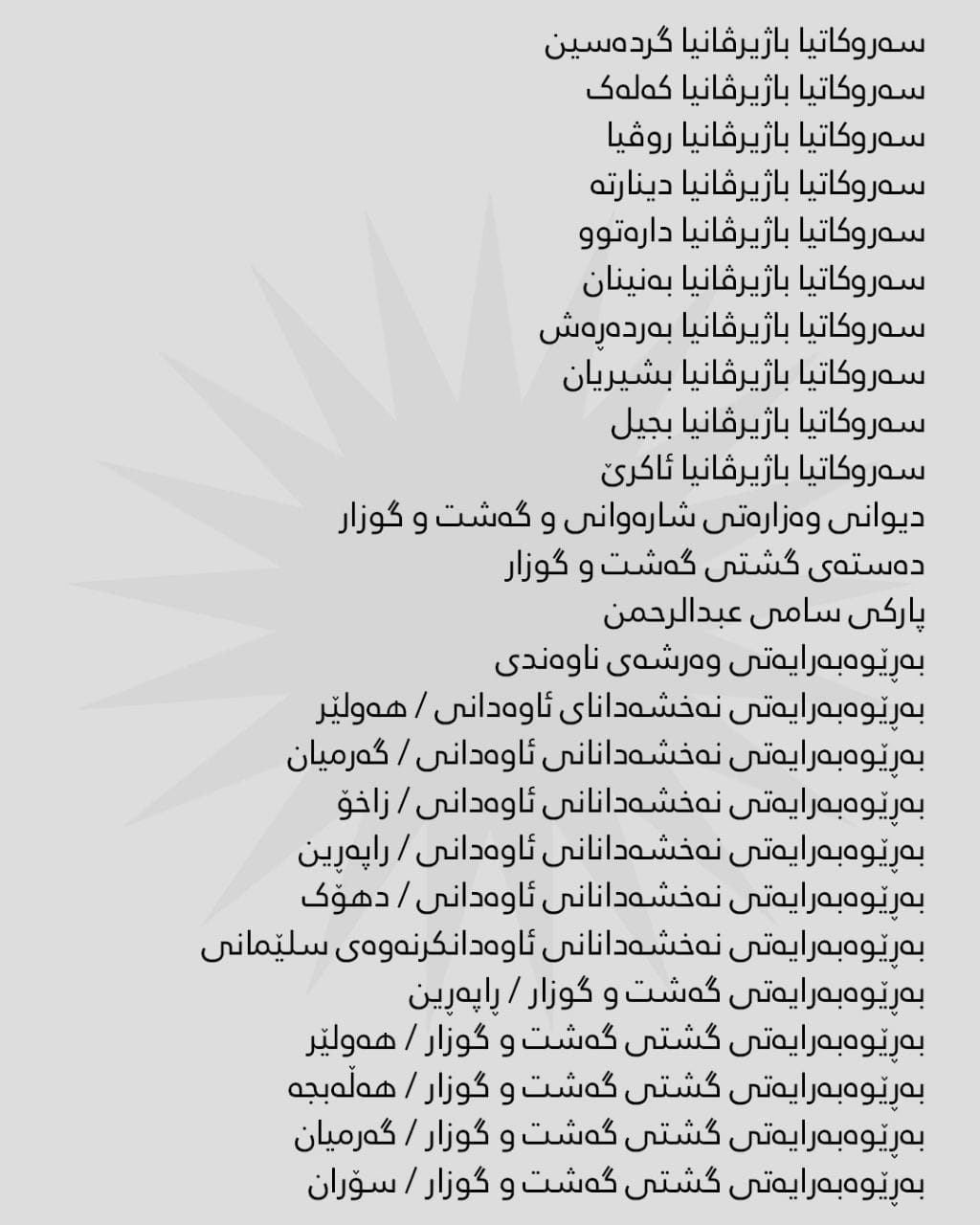 لیستی ناوی فەرمانگە و بەڕێوەبەرایەتی و دەستە و وەزارەتەكان هاوپێچی ئەم هەواڵەیە..