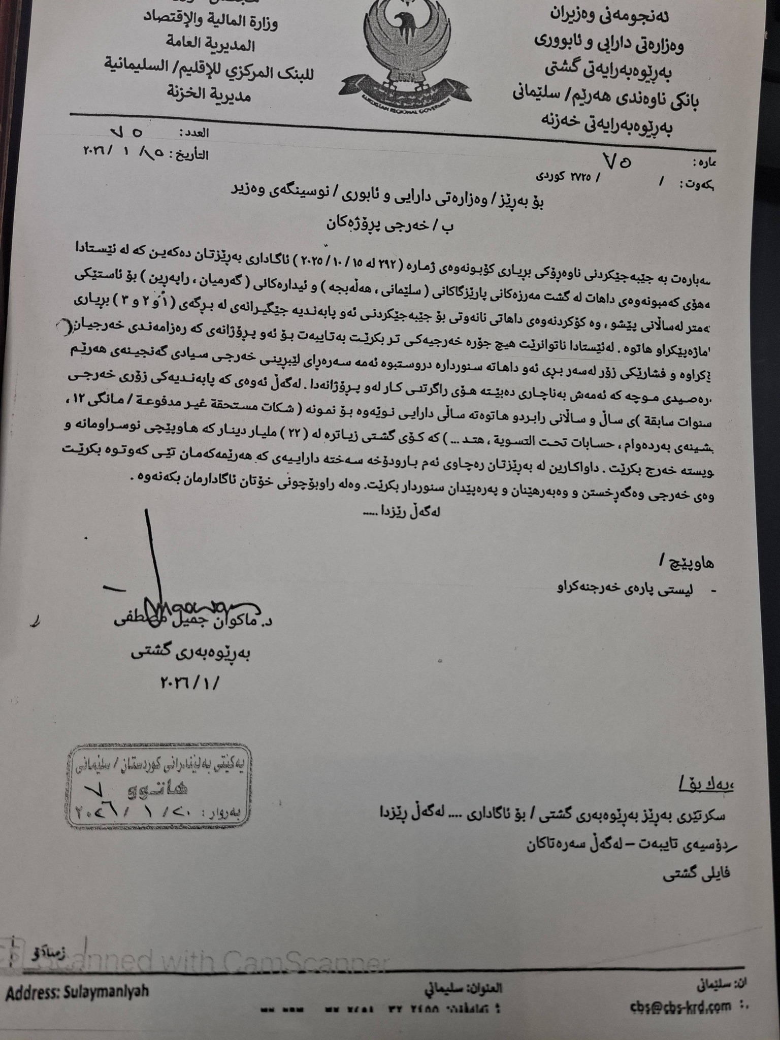 دەشڵێت، پاش هەوڵ و كۆششی یەكێتیی بەڵێندەرانی كوردستان لقی سلێمانی، ئاوات شێخ جەناب وەزیری دارایی و ئابووری، بەدەم داواكارییەكەمان هات بە نووسراوی ژمارە (78)، وەڵامی بەڕێوەبەرایەتیی بانكی ناوەندی هەرێمی /سلێمانی داوەتەوە لەسەر خەرجی پارەی پڕۆژەكان.
