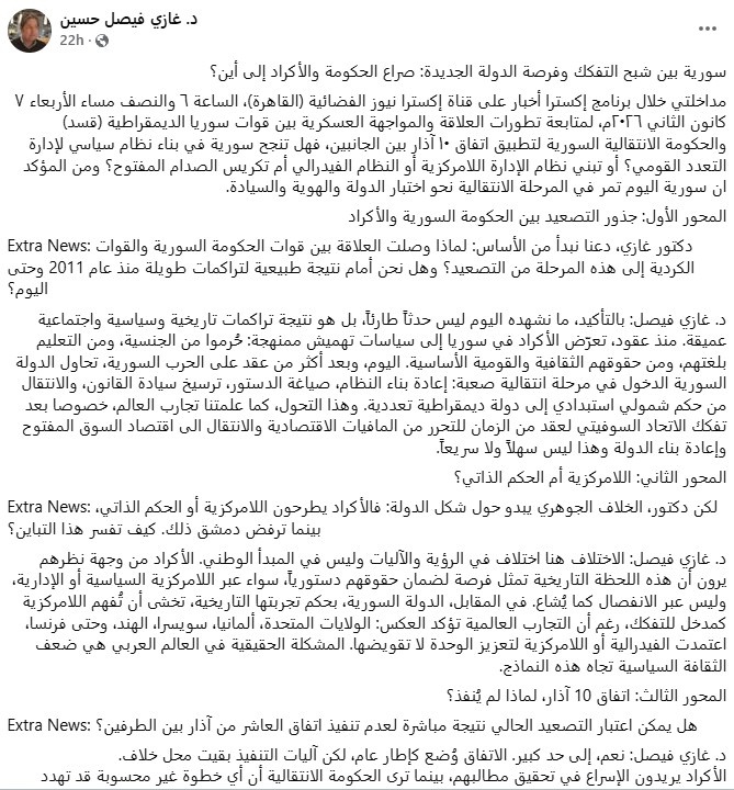 د. غازی فەیسەڵ توێژەری سیاسی لە لێدوانێكی تەلەڤزیۆنی دەڵێت، ئەوەی ئەمڕۆ لە سووریا دەیبینین لە ئەنجامی كەڵەكەبوونێكی مێژوویی و سیاسی و كۆمەڵایەتیی قووڵە، چەندان ساڵە كورد لە سووریا دووچاری سیاسەتێكی رێكخراوی فەرامۆشكردن دەبنەوە، لە ناسنامە و خوێندن بە زمانی خۆیان و مافە كولتووری و نەتەوەییە سەرەكییەكان بێبەش كراون، ئەمڕۆش دوای زیاتر لە 10 ساڵ لە شەڕی ناوخۆی سووریا و گۆڕانی دەوڵەتێكی داپڵۆسێنەر بۆ دەوڵەتێكی دیموكراسی، ئاسان نییە و بەپەلە ناكرێت.
