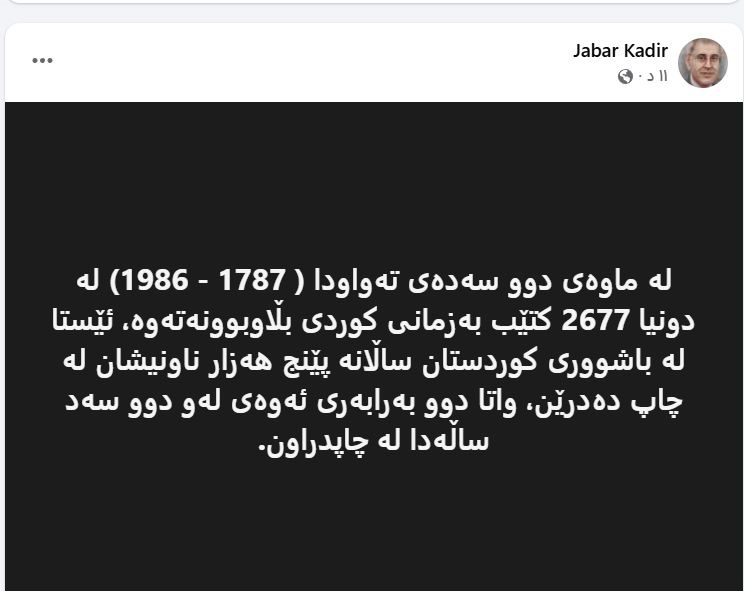 د.جهبار قادر له پۆستێكى فهیسبووك دهنووسێ، "له نێوان 1787 تا 1986 له دنیا 2677 كتێب به زمانى كوردى بڵاوبوونهتهوه، ئێستا له باشوور له ساڵێكدا پێنج ههزار ناونیشان له چاپ دهدرێن".