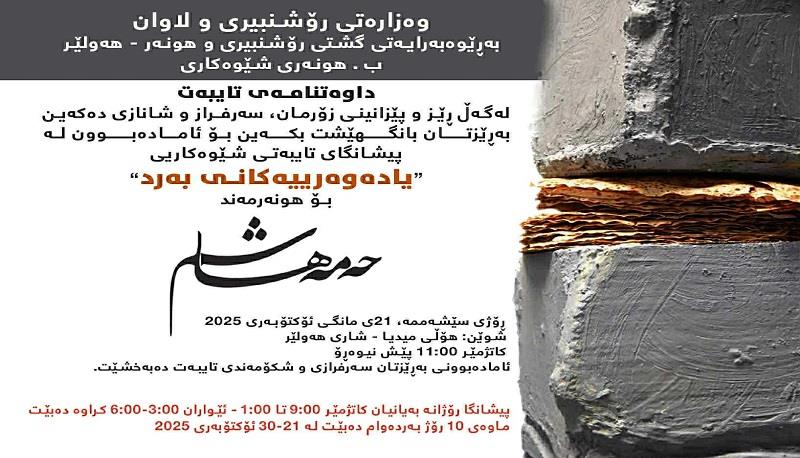پێشانگەكە بە سەرپەرشتیی بەڕێوەبەرایەتیی گشتیی ڕۆشنبیری و هونەری هەولێر- ب. هونەری شێوەكاری دەكرێتەوە.