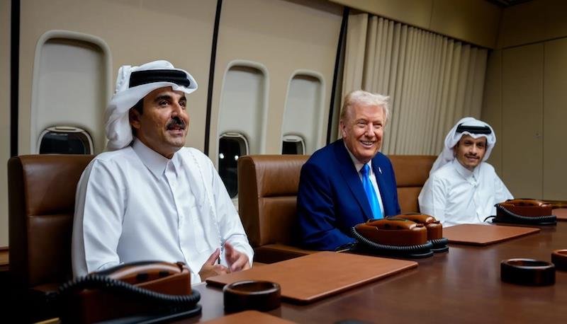 قسهكانی ترهمپ دوای كۆبوونهوهیهكی ناو فڕۆكه هات لهگهڵ میری قهتهر شێخ تهمیم بن حهمهدی دووهم، كاتێك بۆ پڕكردنهوهی تانكی سووتهمهنیی فڕۆكهكهی له دهوحه لایدا.