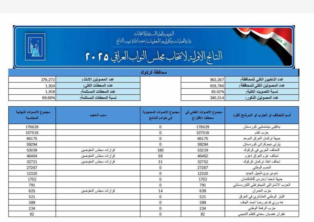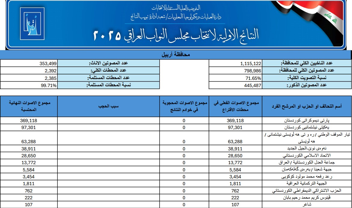 دوێنێ سێشەم 11ی تشرینی دووەمی 2025 هەڵبژاردنی شەشەم خولی پەرلەمانی عێراق بەڕێوە چوو و ئەمڕۆ ئێوارە كۆمسیۆنی باڵای سەربەخۆی هەڵبژاردنەكان لە عێراق ئەنجامە سەرەتاییەكانی هەڵبژاردنەكەی راگەیاند كە وەك كۆمسیۆن گوتی رێژەی بەشداریكردن لە سەرووی 56% بووە.