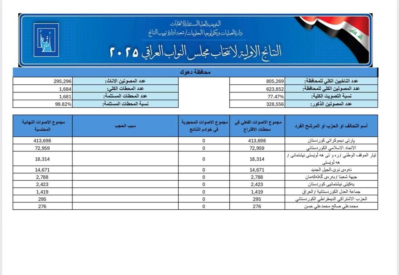 لە پارێزگای دهۆك ژمارەی ئەوانەی مافی دەنگدانیان هەیە 805.269 كەسن و ئەوانەی دەنگیان داوە 623852 كەس بوون و رێژەی دەنگدان 77.47% بووە، ئەنجامەكان، پارتی دیموكراتی كوردستان 413.698 دەنگ یەكگرتووی ئیسلامی 72.959 دەنگ، رەوتی هەڵوێست 18.314 دەنگ و نەوەی نوێ 14.671 دەنگ.