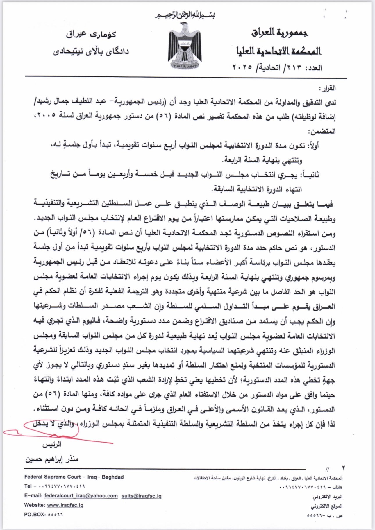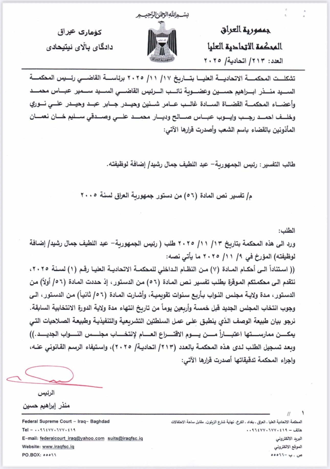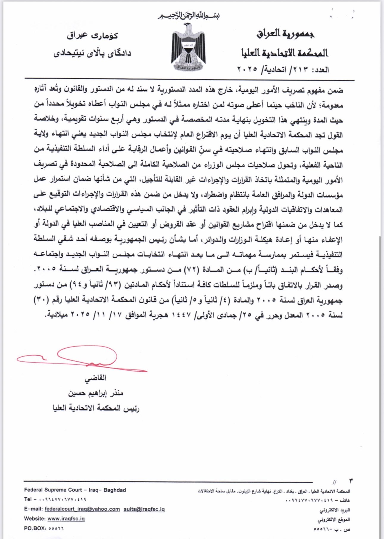 دادگاى فیدراڵى عێراق له ئهنجامى لێكدانهوه یاساییهكان بهوه دهگات، رۆژى دهنگدانى گشتى كه لهم خولهدا له 11ى تشرینى دووهم بهڕێوهچوو، به كۆتایى خولى پێنجهمى پهرلهمان دادهنرێت، بهمهیش حكوومهتى سوودانى دهبێته حكوومهتى كاربهڕێكهر.