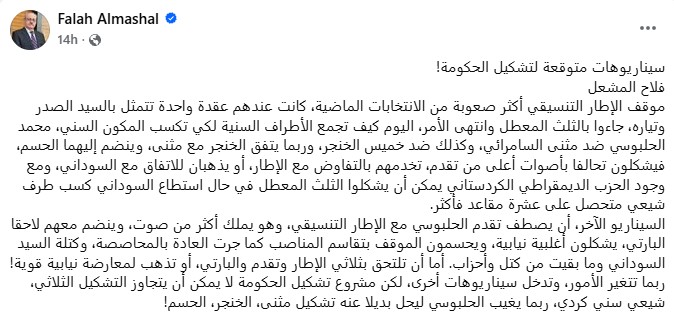 فەلاح مەشعەل نووسەر و شارەزای سیاسی لە پۆستێك لە تۆڕە كۆمەڵایەتییەكان نووسیویەتی، هەڵوێستی چوارچێوەی هاوئاهەنگی بە بەراورد بە هەڵبژاردنەكانی پێشوو سەختترە، لە هەڵبژاردنی پێشوو یەك گرێیان هەبوو، ئەویش موقتەدا سەدر و رەوتەكەی بوو، بۆیە سێیەكی پەكخەریان لە پەرلەمان دروست كرد و كۆتاییان بە كێشەكە هێنا.