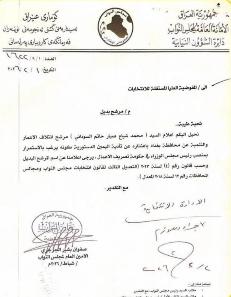 نووسراوێكی ئەمینداریەتیی گشتیی ئەنجوومەنی نوێنەرانی عێراق كە ئاراستەی كۆمسیۆنی باڵای سەربەخۆی هەڵبژاردنەكان كراوە و تیایدا، داوای سوودانیان ئاراستە دەكەن كە پۆزشی بۆ سوێندخواردن وەك كاندیدی هاوپەیمانی ئیعمار و تەنمییە لەسەر پارێزگای بەغدا هێناوەتەوە، بەوەی دەیەوێ لە پۆستەكەی وەك سەرۆك وەزیران لە حكوومەتی كاربەڕێكەر بەردەوام بێت.