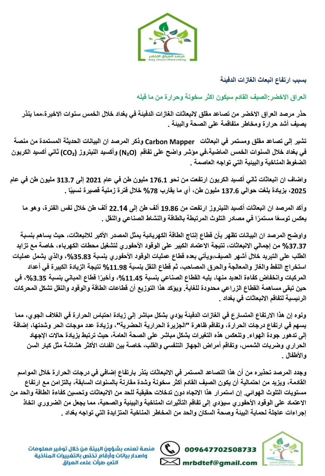 روانگهى عێراقى سهوز پێشبینى دهكات هاوینى ئهمساڵ، گهرمترین هاوین بێت له عێراق بهتایبهتى له بهغداى پایتهخت، بههۆى ئهوهى ههندێك گاز ههن نزیكهى پێنج ساڵه پهنگ دهخۆنهوه.