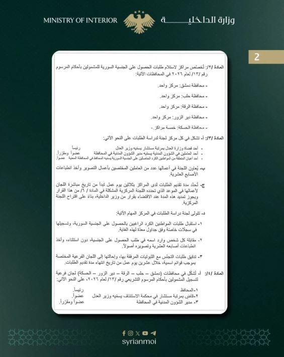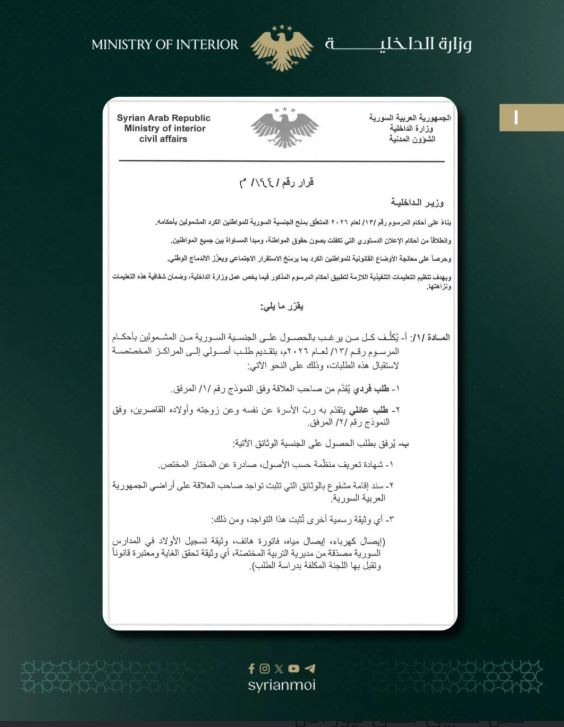 ئهمڕۆ ههینى 20ى شوبات وهزارهتى ناوخۆى سووریا كۆمهڵێك رێنوێنى بڵاوكردهوه، بۆ پێدانى رهگهزنامهى سووریا بۆ هاووڵاتیانى كورد. ئهمهیش بهگوێرهى مهرسوومى ژماره 13ى تایبهت به مافهكانى كورد كه سهرهتاى ئهمساڵ لهلایهن ئهحمهد شهرع سهرۆكى سووریا واژوو كرا.