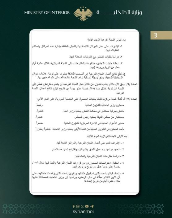 داواكارى وهرگرتنى رهگهزنامه له ماوهى 30 رۆژ دهبێت و به بڕیارى وهزیرى ناوخۆى سووریایش درێژ دهكرێنهوه. ئهو كهسانهیش لهو ماوهیه ناتوانن سوودمهند بن دهتوانن سكاڵا تۆمار بكهن.