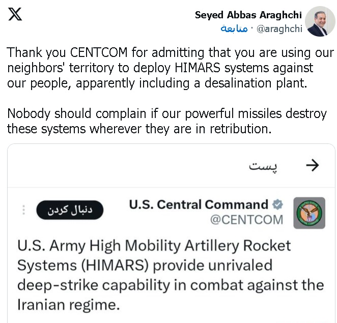 عێراقچی لە ئەكاونتی خۆی لە تۆڕی كۆمەڵایەتی ئێكس، وێنەی پۆستەكەی سێنتكۆمی داناوە و لەگەڵی نووسیویەتی، سوپاس بۆ ئێوە فەرماندەی ناوەندی هێزەكانی ئەمەریكا لە ڕۆژهەڵاتی ناوەڕاست، بۆ ئەوەی ددانتان بەوەدا نا كە خاكی دراوسێكانمان بەكار دەهێنن بۆ بڵاوكردنەوەی سیستمی مووشەكی هیمارس دژی گەلی ئێران.