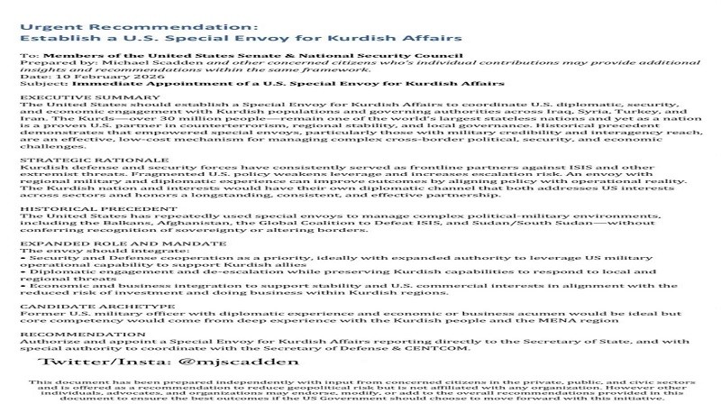 مایكڵ سكادن پسپۆڕی پێوەندییە نێودەوڵەتییەكان پڕۆژە پێشنیازێكی نوێی ئاراستەی ئەنجوومەنی پیران و ئەنجوومەنی ئاسایشی نیشتمانیی ئەمەریكا كردووە، تێیدا داوای دامەزراندنی بەپەلەی "نێردەی تایبەتیی ئەمەریكا بۆ كاروباری كورد" دەكات.