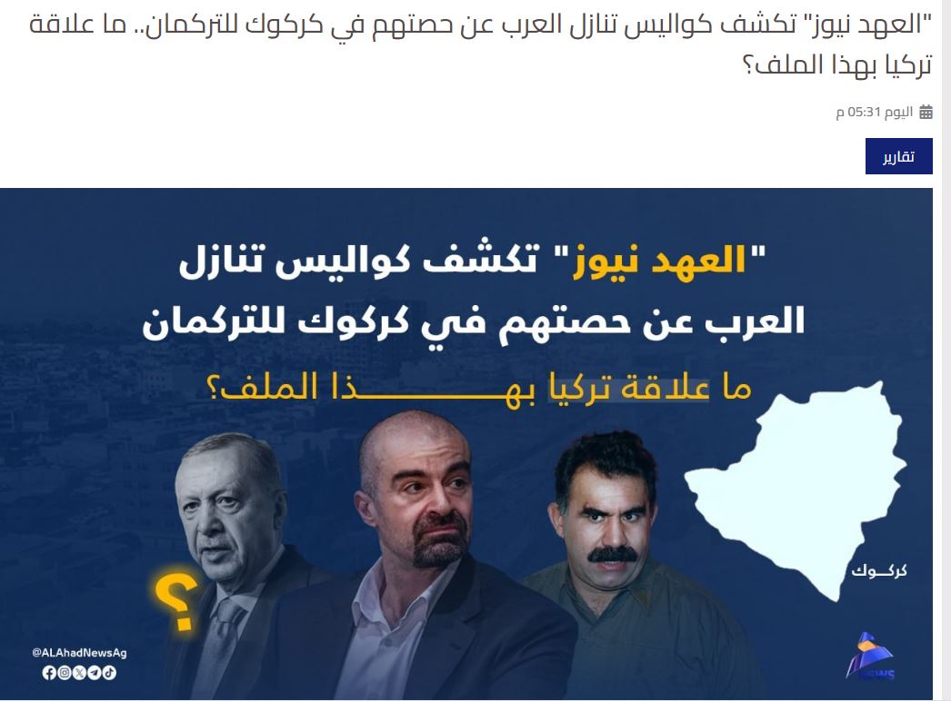 ماڵپەڕی عەهد كە زمانحاڵی میلیشیای عەسایبی ئەهلی حەقە لە راپۆرتێكدا زانیاری نوێ ئاشكرا دەكات و دەڵێ، پێشتر بۆ چەقبەستوویی دۆخی كەركووك قەیس خەزعەلی پێشنیاری ئاڵوگۆڕی دەسەڵاتی لە كەركووك كردووە، بەڵام دواتر بە هۆی نزیكبوونەوەی یەكێتی و سازشی سوننەی كەركووك پۆستەكە بە توركمان دەدرێت، بۆ ماوەی ساڵێكیش نییە بەڵكو هەر دوو ساڵەكە لەلای توركمان دەمێنێتەوە.