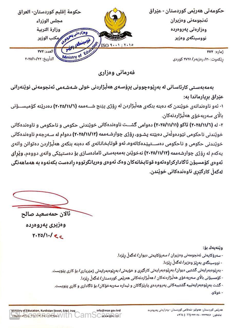 هەروەها ئاماژە بۆ ئەوە كراوە كە لە 6/11 دەبێتە پشوو تا رۆژی چوارشەم 12/11 دەوام لەسەرجەم ناوەندەكانی خوێندنی دەست پێ دەكاتەوە.