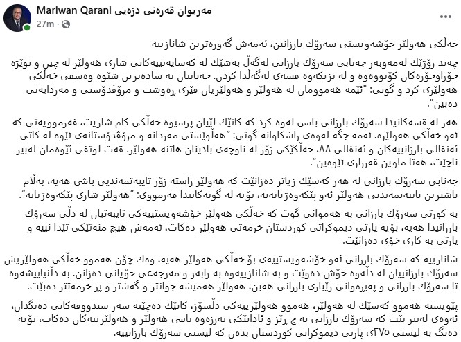 مەریوان قەرەنی پەرلەمانتاری عێراق لە پۆستێك سەبارەت بەو قسانەی سەرۆك بارزانی نووسیویەتی، هەر لە قسەكانیدا سەرۆك بارزانی باسی لەوە كرد كە كاتێك لێیان پرسیوە خەڵكی كام شاریت، فەرموویەتی كە ئەو خەڵكی هەولێرە، ئەمە جگە لەوەی راشكاوانە گوتی، هەڵوێستی مەردانە و مرۆڤدۆستانەی ئێوە لە كاتی ئەنفالی بارزانییەكان و ئەنفالی 1988، خەڵكێكی زۆر لە ناوچەی بادینان هاتنە هەولێر، قەت لوتفی ئێوەمان لەبیر ناچێت و تا ماوین قەرزاری ئێوەین.