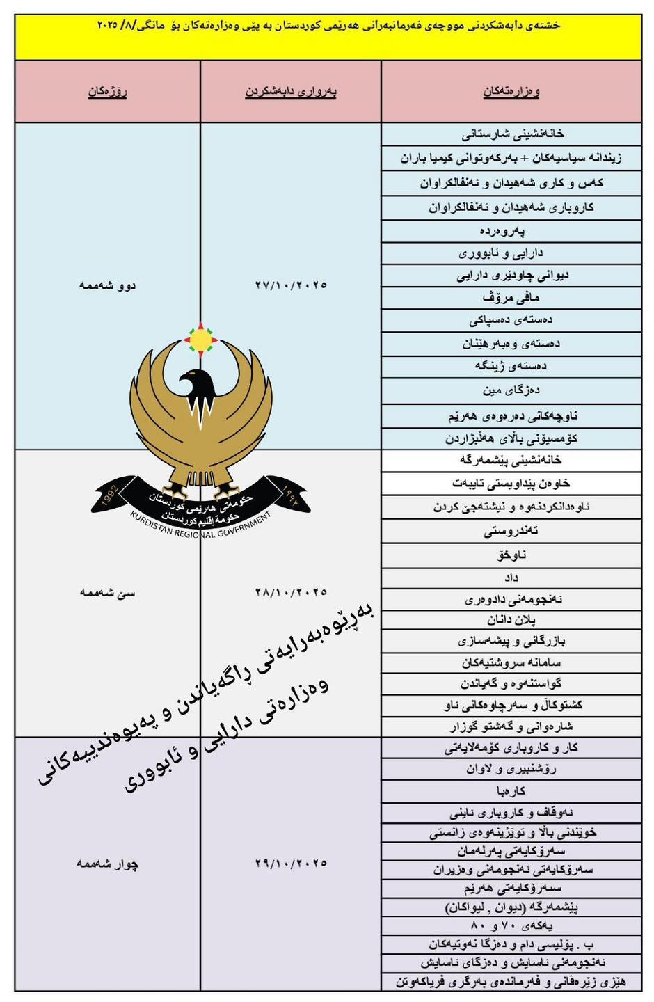وەزارەتەكە رای گەیاندووە، ڕۆژی دووشەم 27ی تشرینی یەكەمی 2025 دەست بەدابەشكردنی مووچەی مانگی ئابی فەرمانبەران و مووچەخۆرانی هەرێمی كوردستان دەكرێت و ڕۆژی چوارشەم 29ی تشرینی یەكەمی 2025 كۆتایی بەدابەشكردنی مووچە دێت.