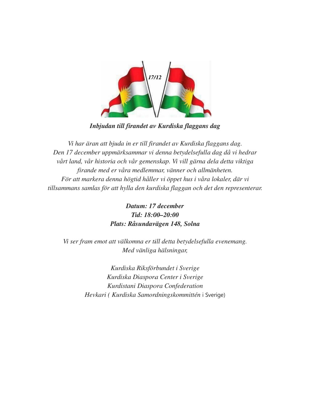ئاماژەی بۆ ئەوەیش كرد، لە لۆكاڵی فیدراسیۆنی كۆمەڵە كوردستانییەكان لە ستۆكهۆڵم دەستەی كارگێڕیی رەوەندی كوردستان لە سوید، بە هەڵكردنی ئاڵای كوردستان ئەو رۆژە بەرز رادەگرن.