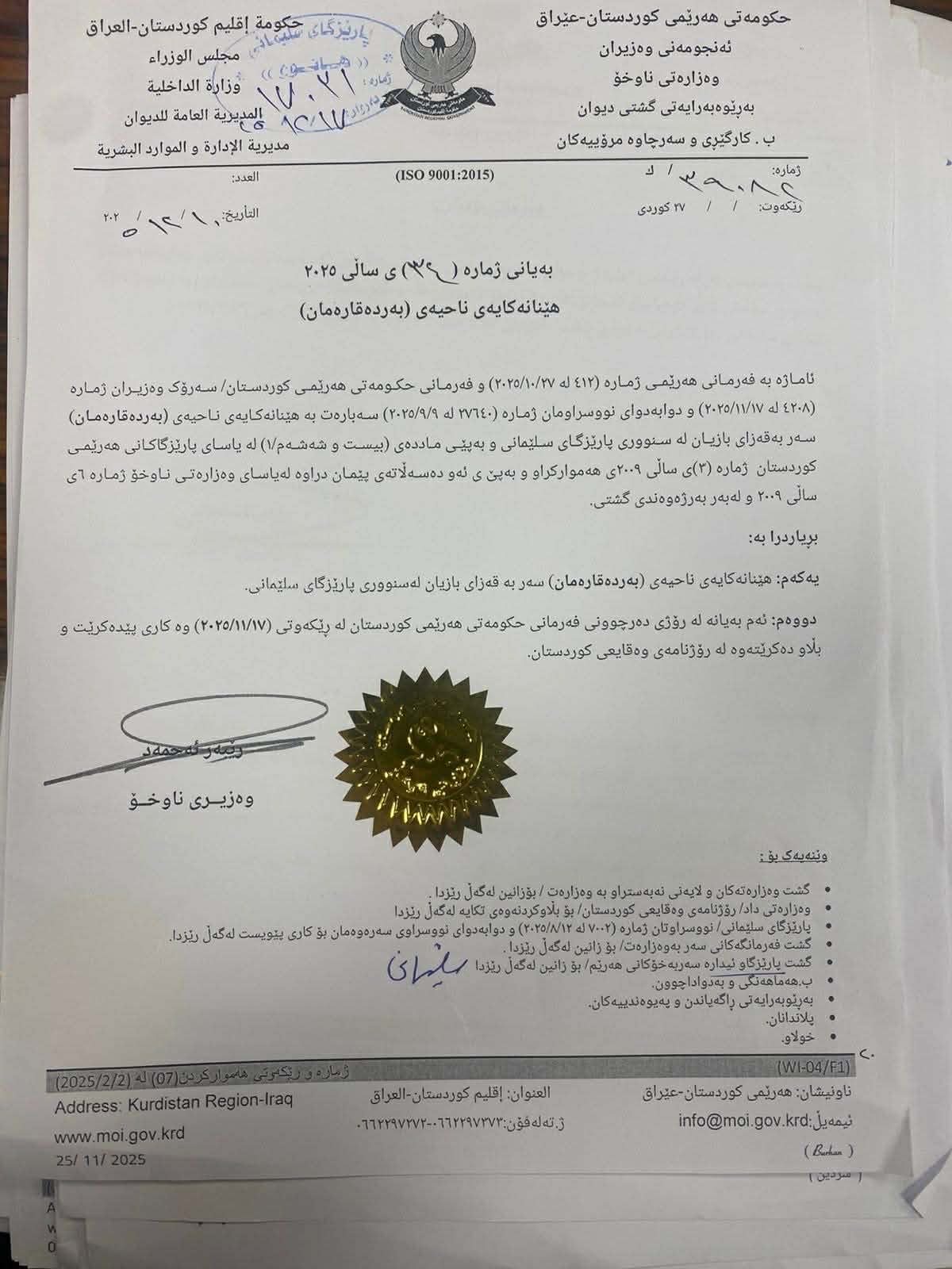 وەزیری ناوخۆی حكوومەتی هەرێمی كوردستان، فەرمانێكی بۆ شارۆچكەی بەردەقارەمان دەركرد.