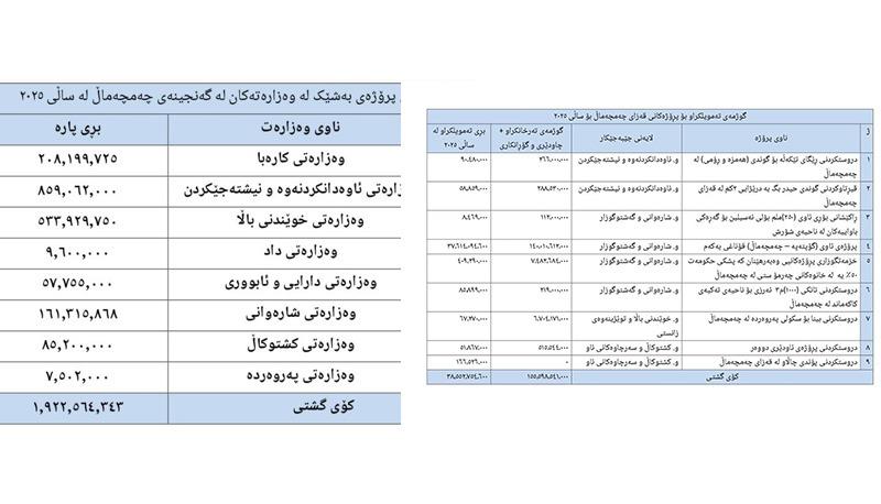 هەروەها لە خشتەیەکی تردا، وەزارەتی دارایی تەمویلی پڕۆژەی بەشێک لە وەزارەتەکانی لە گەنجینەی چەمچەماڵ بۆ ساڵی 2025 خستووەتە ڕوو، کە کۆی گشتییەکەی نزیکەی دوو ملیار دینارە و پشکی شێر بەر وەزارەتەکانی ئاوەدانکردنەوە و خوێندنی باڵا کەوتووە.