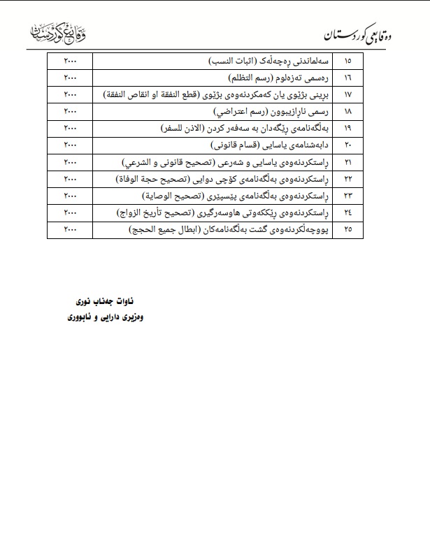 وەزارەتی دارایی و ئابووری حكوومەتی هەرێمی كوردستان لەسەر كرێی مامەڵەی هاووڵاتییان لە دادگاكان، بڕیاری دا و بەم بڕیارەش ئەو نرخانەی دانراون، جێگیر كراون.