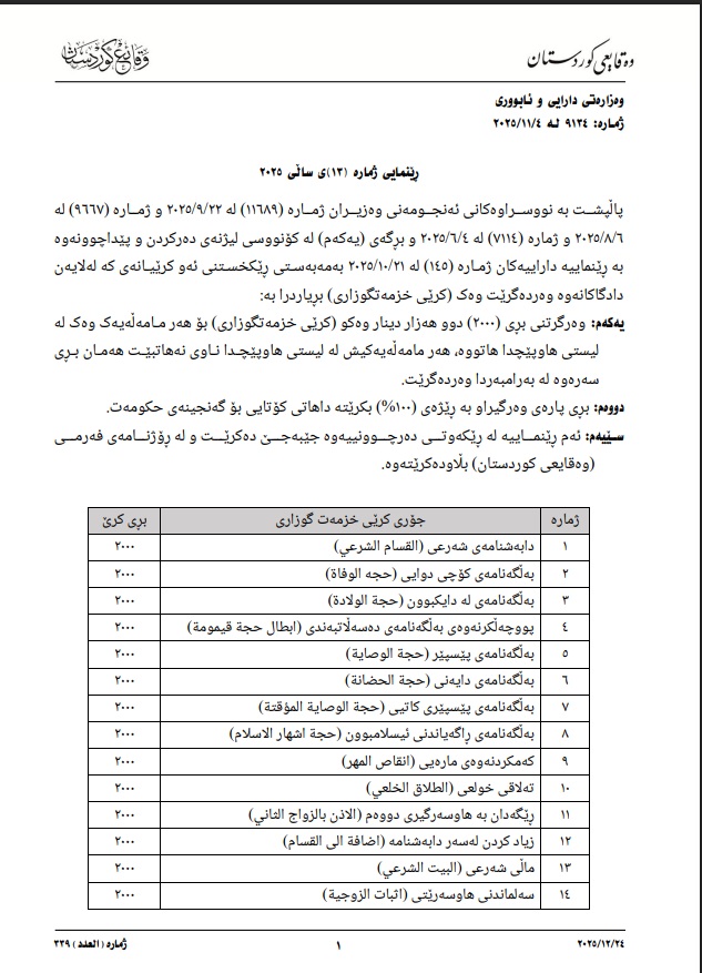 لەو ژمارەیە وەزارەتی دارایی و ئابووری، بڕیاری لەبارەی ئەو بڕە پارەیە داوە كە وەك كرێی خزمەتگوزاری لە دادگاكان وەردەگیرێت و تێیدا هاتووە:
