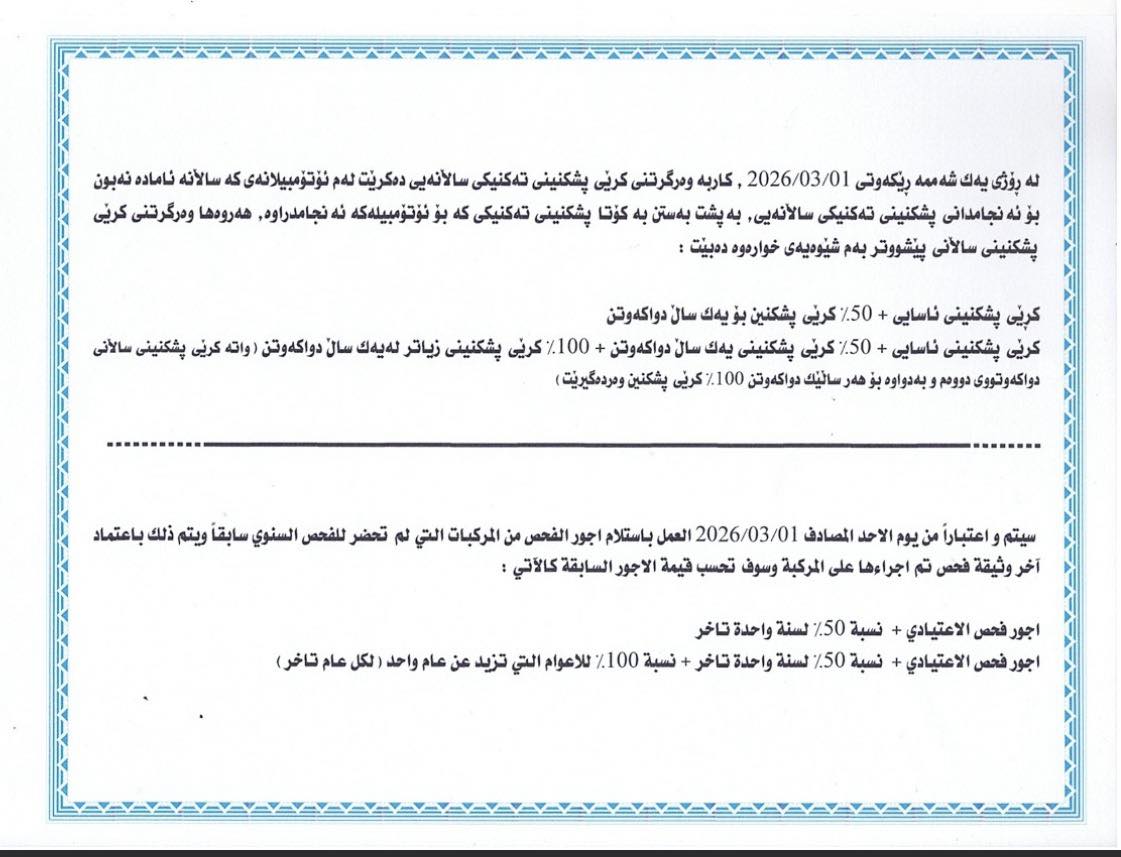 ئەمڕۆ یەكشەم هەشتی شوبات، كۆمپانیای OPVI بڵاوی كردووەتەوە، رێنوێنیی نوێ بۆ پشكنینی ئۆتۆمبێلی ساڵانە دانراون و بەپێی رێنوێنییە نوێیانە، كرێی پشكنینی ساڵانە و سزای دواكەوتن بەگوێرەی كۆتا پشكنین كە بۆ ئۆتۆمبێلەكە ئەنجام درابێت دیاری دەكرێت.