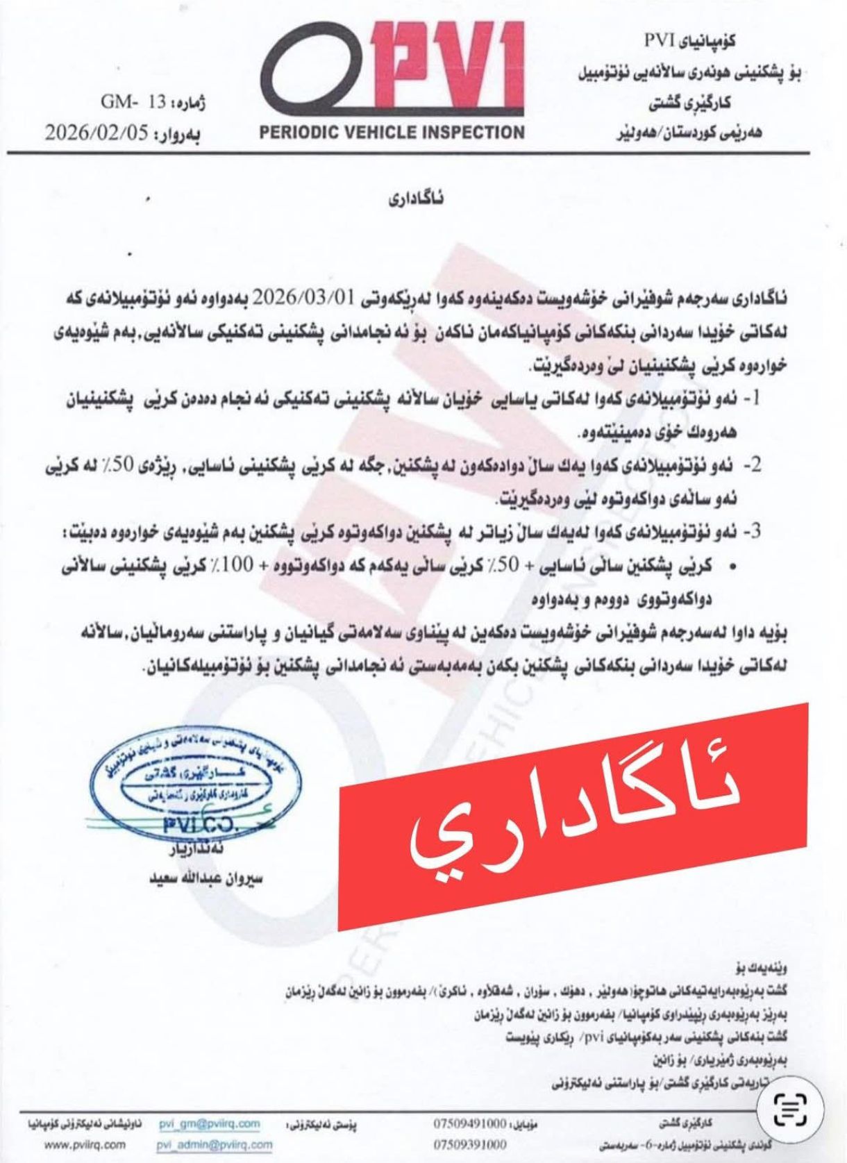 ئەمڕۆ كۆمپانیای OPVI بڵاوی كردووەتەوە، رێنوێنیی نوێ بۆ پشكنینی ئۆتۆمبێلی ساڵانە دانراون و بەپێی رێنوێنییە نوێیانە، كرێی پشكنینی ساڵانە و سزای دواكەوتن بەگوێرەی كۆتا پشكنین كە بۆ ئۆتۆمبێلەكە ئەنجام درابێت دیاری دەكرێت.