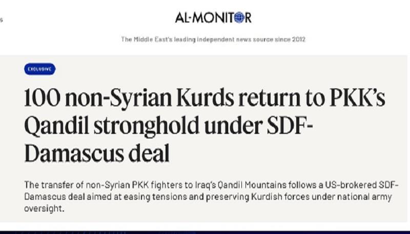 ماڵپەڕی "ئەلمۆنیتەر"ی ئەمەریكی لە زاری سێ سەرچاوەوە بڵاوی كردووەتەوە، شەوی سێشەم 100 گەریلای پارتی كرێكارانی كوردستان (پەكەكە) خاكی سووریایان بەرەو هەرێمی كوردستان جێهێشتووە.