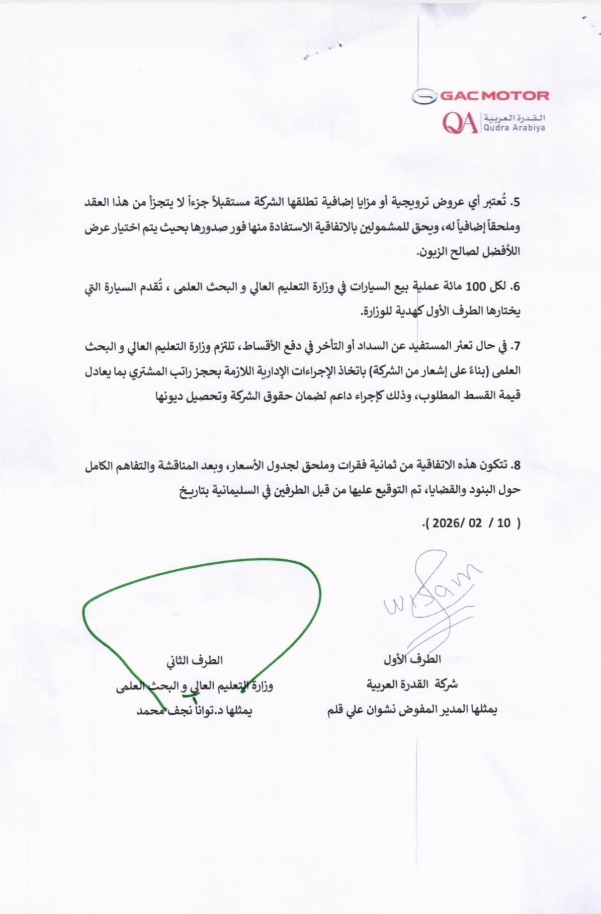 زیاتر گوتی، پوختەی گرێبەستی نێوان وەزارەتی خوێندنی باڵا و كۆمپانیای GAC Motor، بریتییە لە نووسراوێكی فەرمی و گرێبەستێك لە نێوان وەزارەتی خوێندنی باڵا و توێژینەوەی زانستی و كۆمپانیای القدرە العربیە (ویكلی سەرەكی GAC Motor) بۆ فرۆشتنی ئۆتۆمبێل بە فەرمانبەران و مامۆستایانی وەزارەت.