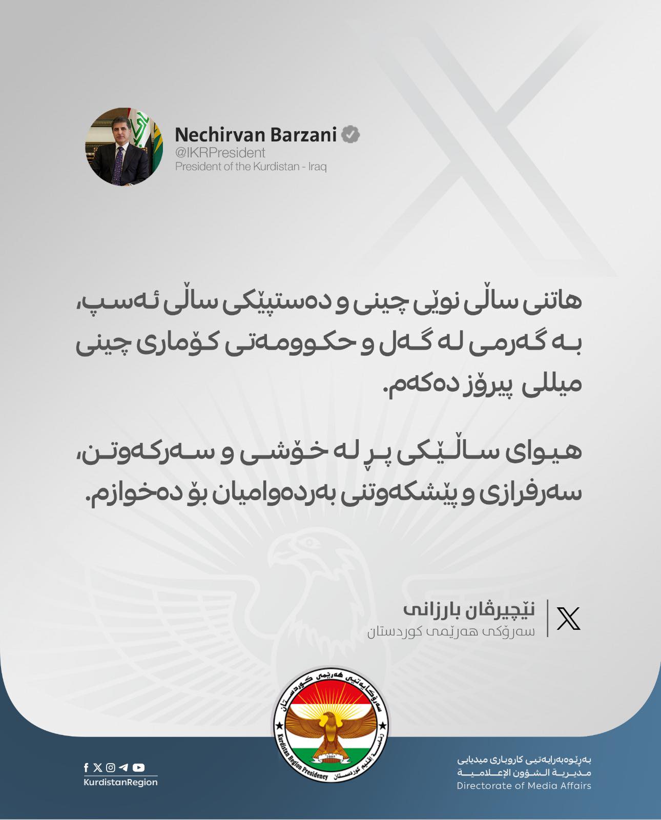 لە پەیامەكەی نێچیرڤان بارزانی سەرۆكی هەرێمی كوردستان كە لە X بڵاوی كردووەتەوە، هاتنی ساڵی نوێی چینی و دەسپێكردنی ساڵی ئەسپ لە گەرمی لە گەل و حكوومەتی كۆماری چینی میللی پیرۆز دەكەم.