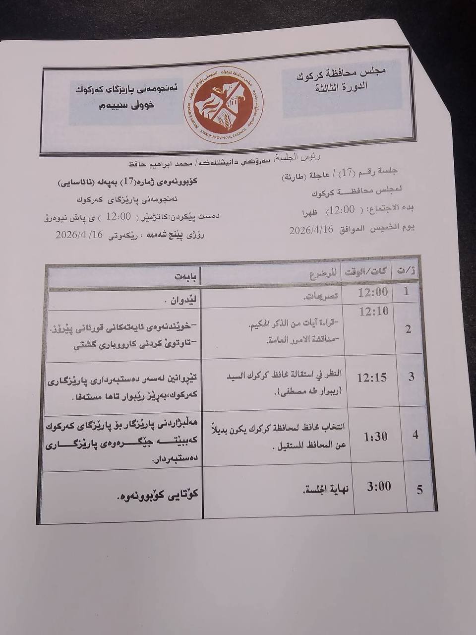 ئەمڕۆ چوارشەم 15ـی نیسان، بەپێی زانیارییەكان سبەی رێبوار تەها وەك پارێزگار دەست لەكار دەكێشێتەوە و دەنگ بە محەمەد سەمعان دەدرێ وەك پارێزگاری نوێی كەركووك.