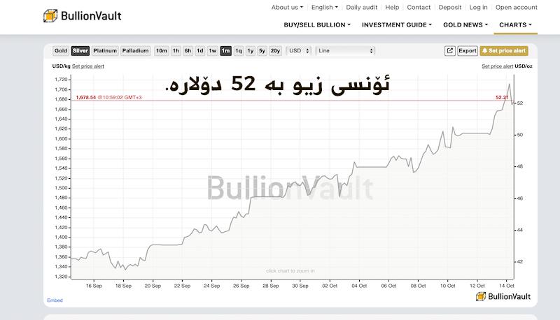 له مانگی تشرینی یهكهمی ساڵی 2022 واته سێ ساڵ لهمهوبهر، نرخی ههر كیلۆگرامێك زیو 600 دۆلار بوو، بهڵام دهبینرێت لهو كاتهوه نزیكهی ههزار و 100 دۆلاری هاتووهته سهر.