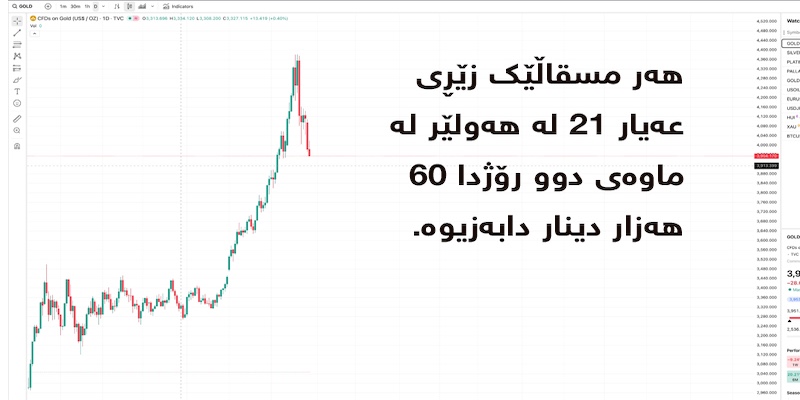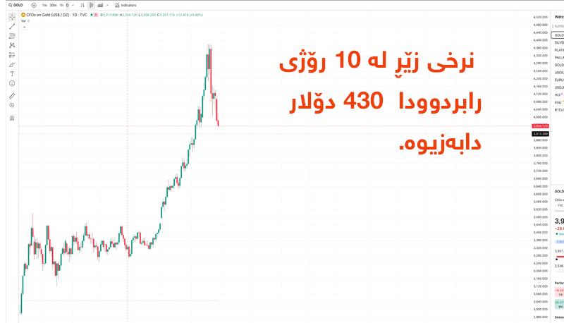 ههفتهی رابردوو بۆرسهی زێڕ بۆ یهكهم جار له دوای نۆ ههفته، به رهنگی سوور داخرابوو و به رێژهیهكی بهرچاو له نرخهكهی دابهزیبوو، بهڵام له دوێنێوه كه بازاڕهكه كراوهتهوه زیاتر دابهزیوه. نرخی ئێستهی ئۆنسێك زێڕ بهراورد به سهرهتای ههفتهی رابردوو 430 دۆلار دابهزیوه.