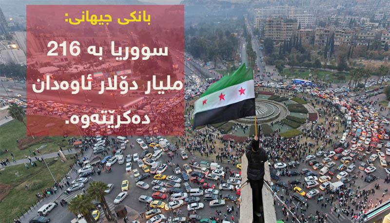 بهپێی خهمڵاندنی بانكی جیهانی سووریا بۆ ئاوهدانكردنهوه، پێویستی به 216 ملیار دۆلار ههیه. له مانگی تهمووزی ئهمساڵ سعوودیه رای گهیاند، به قهبارهی شهش ملیار دۆلار وهبهرهێنان له سووریا دهكات، بهڵام لهبهر سزاكان نهیتوانیوه به كردهنیی ههنگاو بنێت.