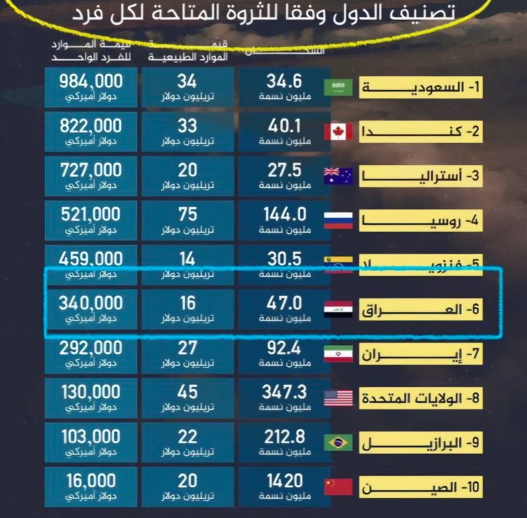 " Visual Capitalist"، كە پۆلێنی وڵاتانی بەپێی بڕی داهاتی سروشتیی هەر تاكێك كردووە، عێراق لە پلەی شەشەمی دنیا دێت لە لیستی دەوڵەمەندانی دنیا لە رووی داهاتەوە، كاتێك بڕی داهاتی هەر تاكێكی عێراقی 340 هەزار دۆلارە، ئەوەش بە خەمڵاندنی بەهای سەرچاوە سروشتییەكانی بە 16 تریلیۆن دۆلار و ژمارەی دانیشتووانی بە 47 ملیۆن كەس.