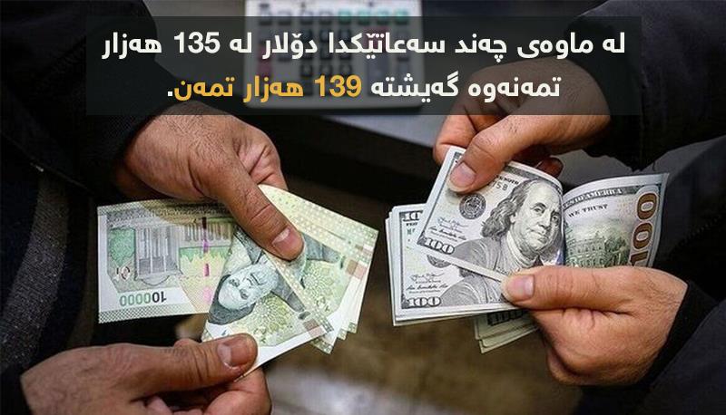 تا بەرەبەیانی ئەمڕۆ شەموو نرخی هەر دۆلارێک را 135 هەزار تمەن گۆڕانکاری بەسەردا هاتبوو و 6% لە بەهای تمەن بەرز ببوویەوە بەڵام ئێستە نوێترین نرخ کە بازاڕ و نووسینگەکانی دراو لە تاران بڵاویان کردووەتەوە نرخی هەر دۆلارێک بۆ 139 هەزار تمەن دابەزیوە.